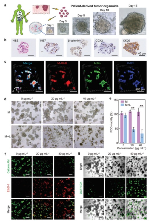 图3. 患者来源的结直肠肿瘤类器官的构建及通过FA改性的AgPd纳米飞镖消融肿瘤类器官。