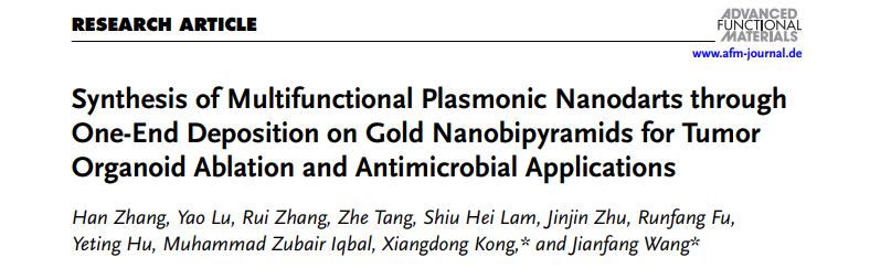 孔祥东教授团队联合香港中文大学王建方教授团队合作报道了一种新型等离激元纳米材料的制备方法,即在金纳米双锥的一端选择性地沉积 AgPd 双金属,形成AgPd 纳米飞镖,从而获得飞镖状纳米结构,在近红外II区光热催化协同作用下,显示出优异的抗肿瘤及抗菌效果。相关成果发表于材料科学TOP期刊Adv. Funct. Mater.(IF=19),通讯作者为体育博彩-体育博彩app