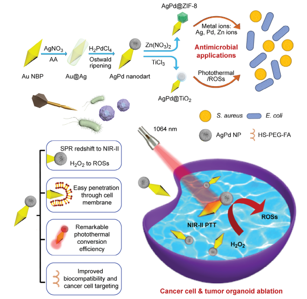 研究团队深入研究了AgPd纳米飞镖的形态演变,探究了其生长机理。所制备的AgPd纳米飞镖显示出优异的光热-催化联合肿瘤类器官消融效果。另外,将ZIF-8和TiO2壳分别选择性包覆在纳米飞镖AgPd一端,上述新型纳米飞镖则展现了出色的抗菌活性(图1)。