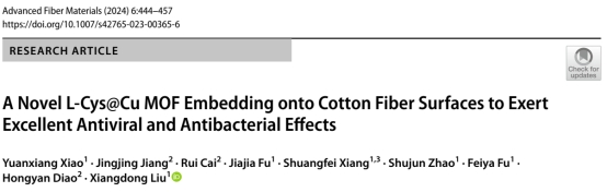 刘向东教授和浙江大学刁宏燕教授在研究具有病毒灭活能力的纤维材料领域取得新进展。研究发现一种新型L-Cys@Cu金属有机框架(MOF)纳米纤维,将其嵌入棉纤维表面可制成抗病毒抗菌织物。相关成果发表于国际权威学术期刊Advanced Fiber Materials(IF=17.2),通讯作者为我院刘向东教授和浙江大学刁宏燕教授。体育博彩