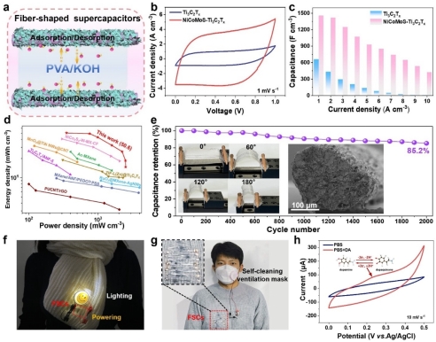 3) 固态纤维状超级电容器的构筑与供电与传感应用:将NiCoMoS-Ti3C2Tx核壳纤维组装成全固态对称纤维状超级电容器器件 (FSCs),其呈现出高体积能量密度 (50.6 mWh cm-3)、比电容 (1456 F cm-3 ) 和长循环稳定性。将封装后的FSCs集成到织物 (毛衣、围巾等) 中,能够稳定地为照明、自清洁通风面罩和电风扇等供电;此外,构筑的NiCoMoS-Ti3C2Tx纤维非酶生物电化学传感器可对多巴胺进行实时检测,并表现出良好的灵敏度和较低的检测限。