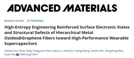 该工作从设计纤维电极有序微结构和高电化学活性入手,以强化界面法拉第电荷转移、离子传质、赝电容存储为目标,构筑了高熵掺杂金属氧化物@石墨烯复合纤维 (HE-MO@GF) 材料,用于高能量密度可穿戴超级电容器研究。该研究成果于发表在国际材料顶级期刊《Advanced Materials》上 (High-Entropy Engineering Reinforced Surface Electronic States and Structural Defects of Hierarchical Metal Oxides@Graphene Fibers towards High-Performance Wearable Supercapacitors, Advanced Materials 2024, 2406483)。该论文的通讯作者是体育博彩