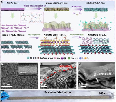 图1. NiCoMoS-Ti3C2Tx纤维的制备及形貌表征