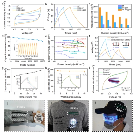 3)固态纤维状超级电容器的构筑与穿戴供电应用:由HE-MO@GF组装成的纤维基对称超级电容器 (FESCs),在固态凝胶电解质中表现出高面积能量密度 (132.85 μWh cm-2)、大比电容 (1952.13 mF cm-2) 与较好的循环稳定性 (10,000次)。同时,FESCs在宽温域、多次水洗与不同浓度汗液等苛刻条件下,能够稳定工作。通过串并联方式将FESCs集成,可提高器件的输出电压与电流,满足了实际应用中设备对高工作电压和容量的需求。将FESCs与织物进行集成,实现了为各种可穿戴设备 (如手表、徽章和发光眼镜) 供电的应用。