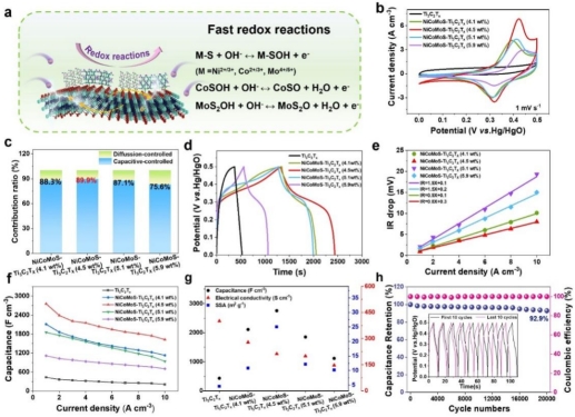 1) 核壳纤维强化的界面电荷转移、离子吸附/扩散与多电子反应动力学:基于非原位XPS和DFT计算结果表明,原位生长的NiCoMoS多金属硫化物与OH-之间的氧化还原反应具有高度的可逆性;NiCoMoS提供了大量的活性位点,降低了OH-在纤维层内的扩散能垒 (从0.17到0.09 eV),并增强了对OH-的吸附能 (-0.7到-6.5 eV);Ti-O-M (M = Ni, Co, Mo) 化学键合的界面,提高了界面处电荷转移与多硫化物的多电子氧化还原反应;因此,NiCoMoS-Ti3C2Tx纤维具有强化的界面电荷转移、离子吸附/扩散与多电子反应动力学。