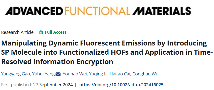 杨玉慧副教授在研究高级信息加密存储领域取得新进展。团队通过将常见的光致变色分子螺吡喃引入到功能化 HOFs中制备时间依赖性信息加密材料。相关成果发表于国际权威学术期刊Advanced Functional Materials(IF=18.5),通讯作者为我院杨玉慧副教授。体育博彩-体育博彩app