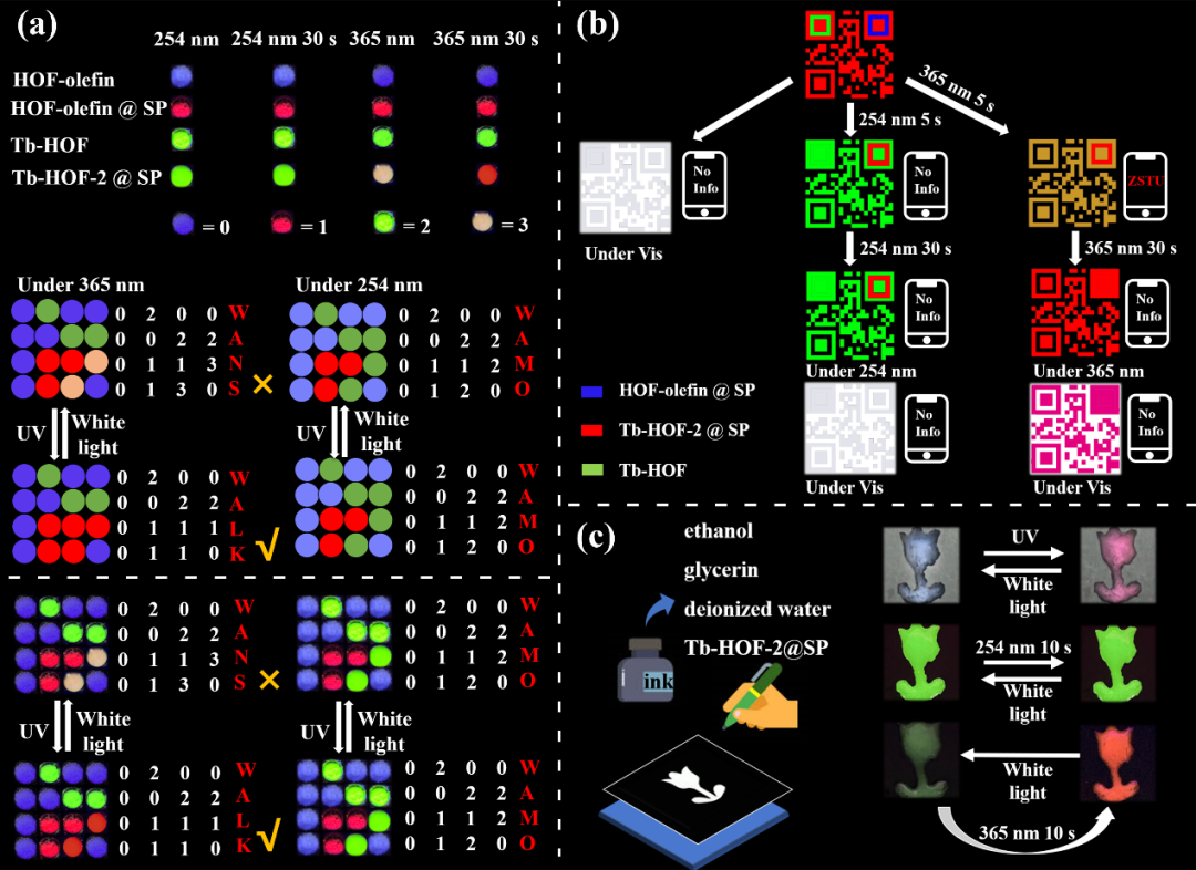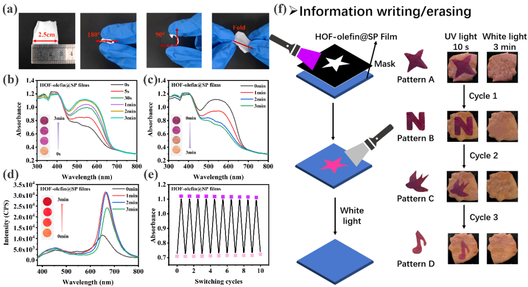 图1. HOF-olefin@SP的光致变色,光致发光性能及其在信息写入/擦除中的应用