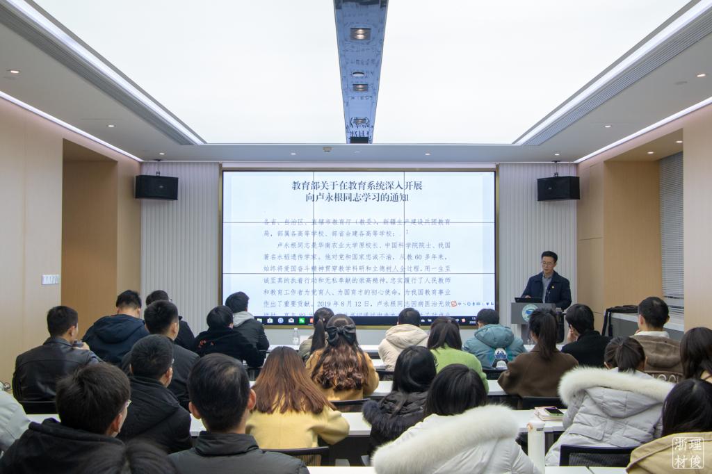 会议伊始,学院党委委员周照东老师带领大家集体学习卢永根同志的先进事迹。他强调,卢永根同志是习近平新时代中国特色社会主义思想的坚定信仰者和忠实践行者,是践行“四有”好老师要求的师表楷模,是新时代崇高师德的杰出典范。全体师生党员要学习卢永根同志爱党爱教,为国家事业矢志奋斗的坚定信念;要学习卢永根同志潜心钻研、为造福人民勇于攀登的赤诚情怀;要学习卢永根同志立德树人、为培育英才鞠躬尽瘁的使命担当;要学习卢永根同志艰苦朴素、为助教励学无私奉献的崇高精神。学院全体党员同志要以卢永根同志为榜样,立足本职做好本职教学、科研、学业等各项工作。