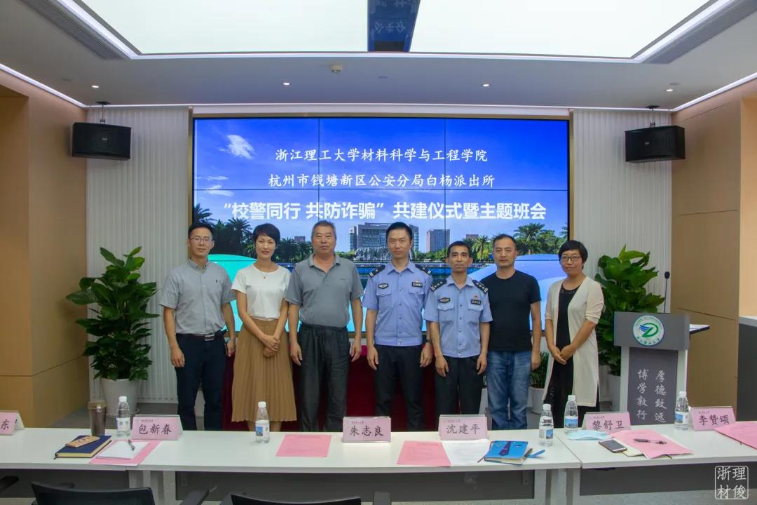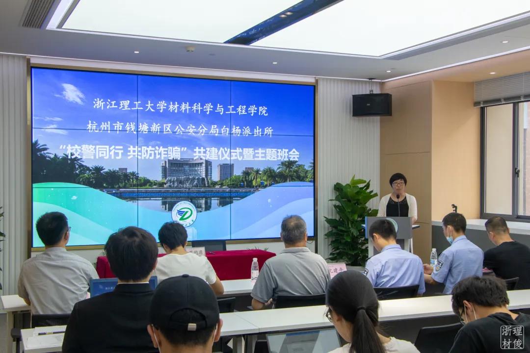 联合杭州市钱塘新区公安分局白杨派出所,在24号楼415报告厅举行“校警同行 共防诈骗”共建仪式暨诚信教育主题班会活动。杭州市钱塘新区公安分局白杨派出所教导员沈建平、民警黎舒卫,校保卫处处长朱志良、副处长包新春,体育博彩