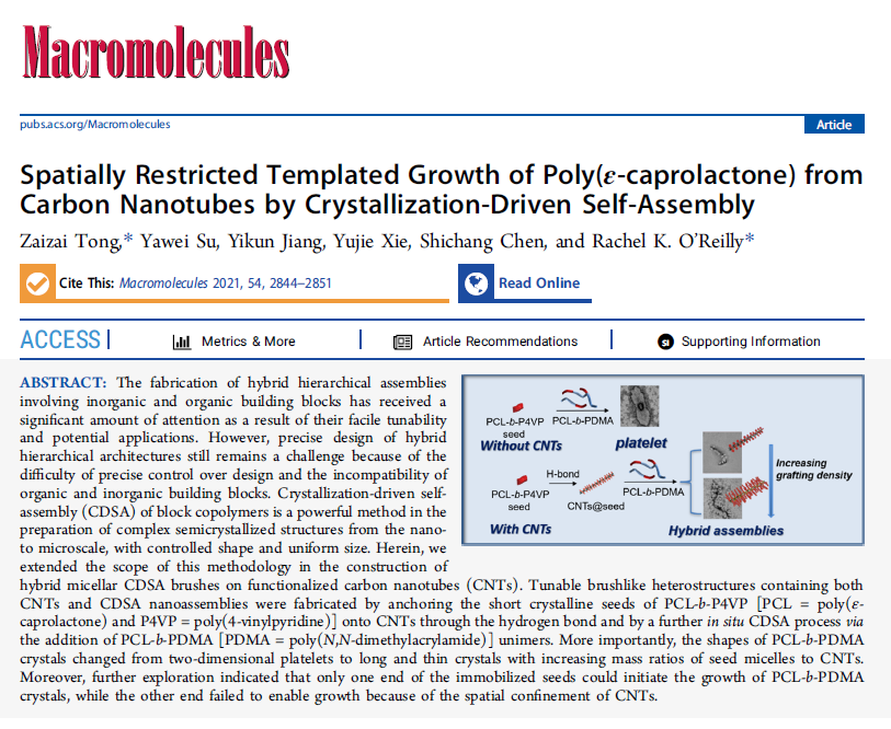 副教授童再再和伯明翰大学Rachel O’Reiily教授合作在国际知名期刊Macromoleculs上发表题为《Spatially Restricted Templated Growth of Poly(ε-caprolactone) from Carbon Nanotubes by Crystallization-Driven Self-Assembly》的文章,报道了课题组在结晶驱动自组装可控制备杂化纳米材料领域取得的突破性成果。