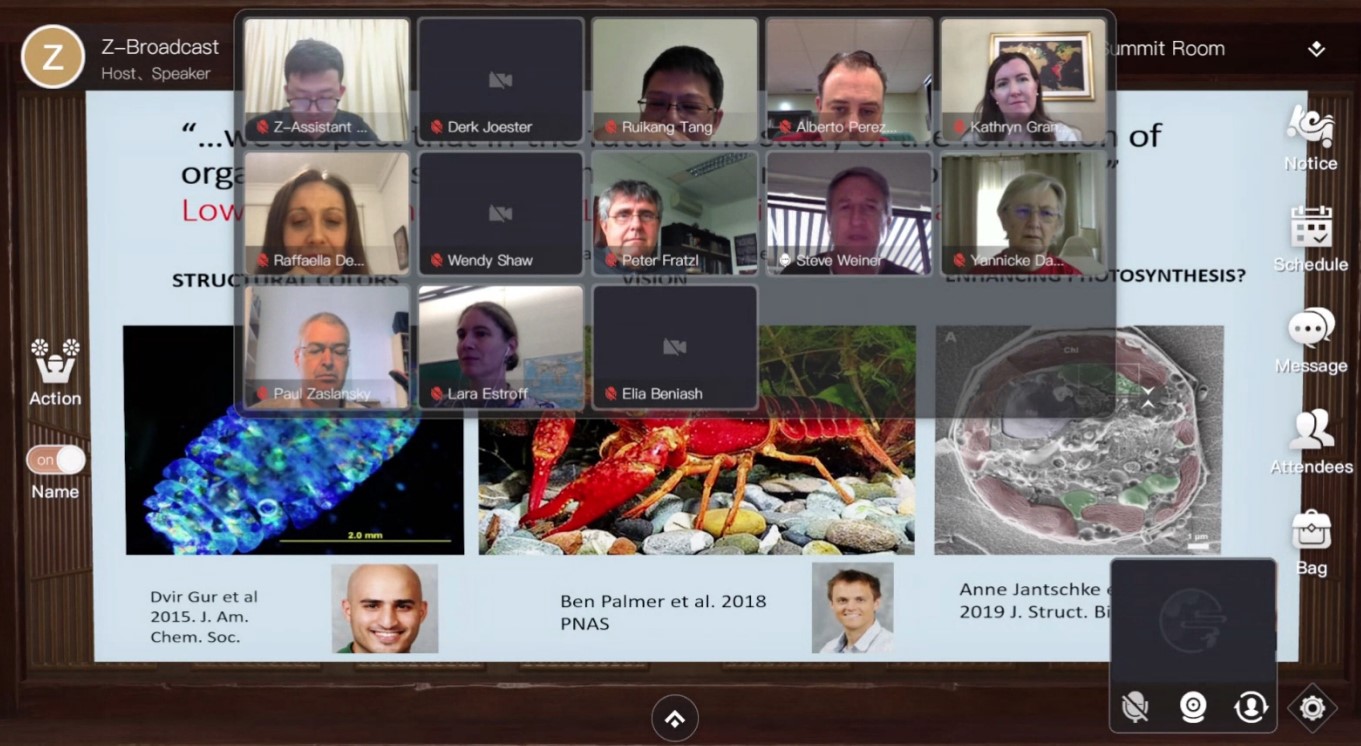 受COVID-19疫情影响,本次会议采用全程线上会议的形式,这给会议的成功举办带来了巨大挑战。会议举办方独辟蹊径,通过与网易伏羲实验室合作,特意打造了全新的“瑶台”沉浸式会议系统。为了让参会者有参加“真实会议”的体验,“瑶台”系统在网络中打造出虚拟会议场景(会议大厅、墙展厅、会客厅、峰会圆桌会议室以及茶室休闲区),让与会者在线上也有最真实的会议体验。本次会议共安排了16场主旨报告,11场特邀报告,35场口头报告,16场学生报告和35场墙展报告。会议还特意设置了生物矿化峰会环节,邀请国际知名生物矿化顶尖专家Peter Fratzl教授和Steve Weiner教授为主席,组织了由11名国际生物矿化顶尖专家组成的峰会团队,生动地介绍了生物矿化的研究历史、现状并一起探讨了未来发展的方向,使年轻学者更深入、更全面的理解生物矿化研究的丰富内涵。本次研讨会的组织安排和创新会议形式得到了与会者的普遍认可与高度赞赏。部分学者会后专门祝贺会议的圆满举办并称赞“瑶台”提供了全新的线上会议体验模式。