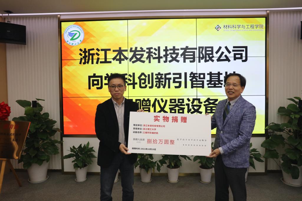 厉勇和陈文兴为学科创新引智基地揭牌。仪式上,嘉宾还为学科创新引智基地学术大师代表倪庆清颁发证书,并为向基地捐赠仪器设备的浙江本发科技有限公司颁发捐赠证书。