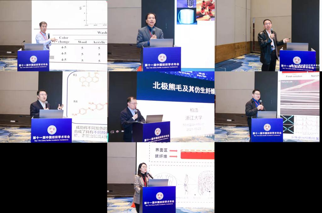 /日本信州大学倪庆清教授、重庆大学付邵云教授、中国科学院宁波材料技术与工程研究所祝颖丹研究员、武汉纺织大学王栋教授、浙江大学柏浩研究员、苏州大学吕强教授和青岛大学马丽春特聘教授等8位国内知名学者围绕“聚酰亚胺纤维材料”、“多元立体纺织结构复合材料”、“短碳纤维复合材料”、“热塑性复合材料”、“高性能纤维大分子材料”、“北极熊毛及其仿生纤维材料”、“基于蚕丝蛋白纳米纤维的生物材料“以及”碳纤维树脂基复合材料“等不同主题分别作了精彩的主题报告。