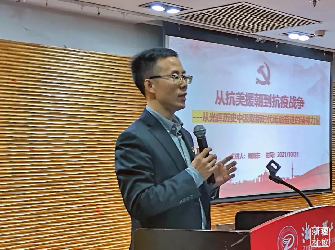 开班典礼结束后,周照东老师为大家带来“材俊先锋”论坛暨党校第一讲:《从抗美援朝到抗疫战争:从光辉历史中汲取新时代砥砺奋进的精神力量》。周老师以近期热映的《长津湖》引入主题,从伟大的抗美援朝战争到如今全民族的抗疫战争,以“体会党史发展的艰难险阻,领会当代党员的历史重任,传承伟大的抗美援朝精神和抗疫精神”为主线展开。