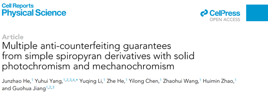 青年教师杨玉慧在Cell旗下新晋高水平期刊《Cell Reports Physical Science》上发表题为《Multiple anti-counterfeiting guarantees from simple spiropyran derivatives with solid photochromism and mechanochromism》的文章,报道了课题组在光致和力致双重刺激响应材料应用于防伪领域取得的突破性成果。