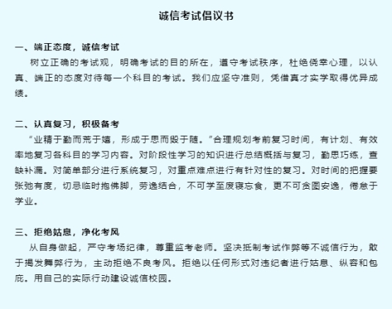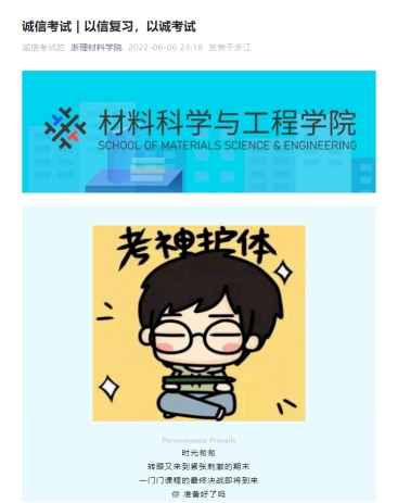 6月正值期末考试季,考试作为检验教师教学质量和学生学习效果的重要手段。而只有诚信考试才能保证结果的公正,同时诚信考试也是对知识和授课老师的必要尊重。为了进一步弘扬诚信考试的良好风气,材料学院开展诚信考试倡议活动,通过线上推送进行宣传,呼吁广大材料学子以信复习,以诚考试。