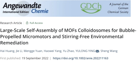 环境净化与健康防护材料研究所青年教师应玉龙特聘副教授在Angew. Chem. Int. Ed.杂志上发表题为《Large-Scale Self-Assembly of MOFs Colloidosomes for Bubble-Propelled Micromotors and Stirring-Free Environmental Remediation》的文章,报告了一种简单、通用的方法,可大规模有效地将小尺寸MOF颗粒快速自组装成中空结构的MOF胶体球 (Fe-UiOSomes),用于气泡驱动微马达的设计和实现无搅拌模式下的水处理。该工作进行了一系列深入的研究来解释不同制备参数条件下(剪切速度、剪切时间、原料浓度、水相与油相相对比例)对其形态演变的影响,进而确定了最佳的实验参数。研究发现,四种制备参数的变化在本质上决定了原料MOF(Fe-UiO NPs)在微乳液体系水相液滴表面的浓度,总的来说可分为高、中、低浓度三种状态。研究表明,Fe-UiO颗粒在高、低浓度下都不足以形成所需的尺寸及形态,只有在适中浓度下才能得到完美的中空坚固球体结构的Fe-UiOSomes。进一步,通过Pt NPs的引入,设计了气泡驱动的MOF微马达,对其运动行为进行了研究,并实现了环境中有机(甲基橙MO)或重金属离子(六价铬CrVI)污染物的快速去除。由于自组装形成的多通道结构和自驱动特性,该微马达MO和CrVI污染物的去除效率高达94%和91%,接近于对照组中使用机械振荡方式的去除效率(96%和97%),证实本工作中MOF胶体球微马达有效代替或补充常见的机械处理用于环境中污染物处理的潜力和优势。该研究为基于小尺寸MOF基气泡推进微马达的设计提供了一种新方法,该方法可以扩展到其他功能性纳米粒子用于微马达的设计,并揭示了气泡驱动微马达在环境处理中具有替代或补充传统机械搅拌的潜力。