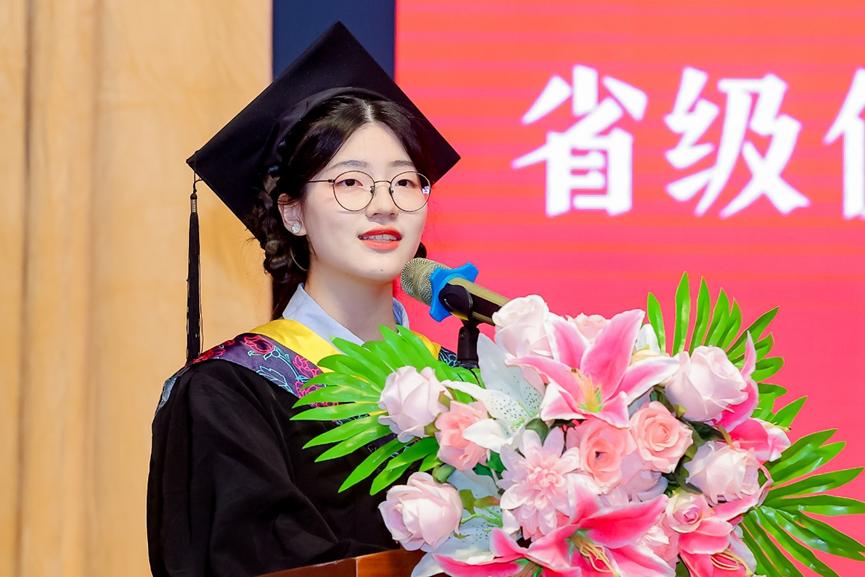 她首先表示很荣幸作为研究生毕业生代表发言,三年中有太多的第一次,让她收获了许多宝贵的友谊和人生经验。她希望毕业生们无论怀揣着怎样的忐忑,都有足够的勇气去面对挫折,追逐梦想。愿历尽千帆,归来仍是少年!