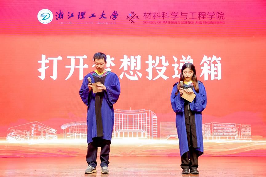 毕业生代表王朝晖、汪佳俊拆开自己入学时写下的梦想,分享感受。
