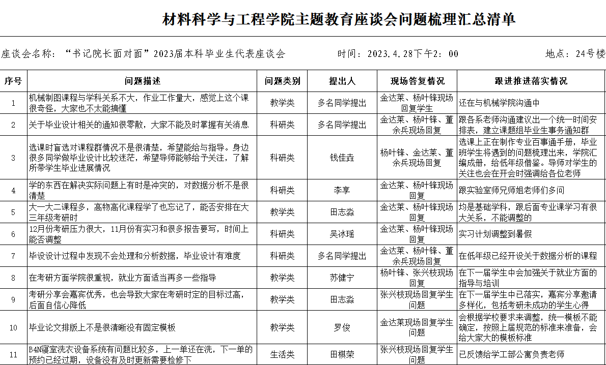 干部以等多种形式,召开9场各类师生座谈会,准确了解师生群众所思所想所急所盼,提高调研结果的科学性和实效性。三是“问”良策。根据学校大兴调查研究工作方案,学院党委聚焦事业发展核心,由书记与院长分别领衔“高层次人才引育”“高质量人才培养”两大课题,依靠师生智慧破解发展难题,依靠师生力量推动事业发展。四是“切”症结。对于在调研中反映和发现的问题,逐一梳理,形成问题清单、任务清单,共收集和梳理问题67个,均已明确整改措施和期限,目前已解决52个。认真用好用活案例资源,以点带面推动整体工作实现新提升。