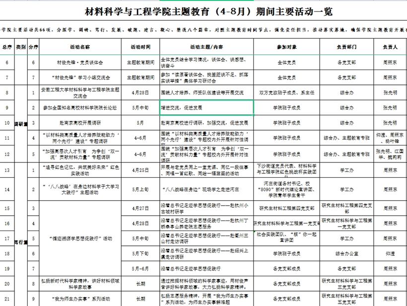 对主题教育的推进落实,学院党委始终坚持“一盘棋”思想,从全局出发,将主题教育和学院各项事业深度融合,积蓄推动学院高质量发展的势能。一是“四个结合”谋部署。坚持深度贯通结合,即将主题教育与学习贯彻党的二十大精神相结合,与推动学校“双一流”建设相结合,与材料与化工专业博士点申报相结合,与党建“双创”培育创建相结合,立足学院实际,扎实推进主题教育走向深入。二是“三级联动”促落实。坚持以高度的政治自觉谋划组织,构建起“学院党委-工作专班-党支部”三级联动机制,将理论学习、调查研究、检视问题、专项整改、建章立制等工作一体推进,及时提醒、切实督促,确保形成工作“回路”。三是“双向发力”保成效。构建“学院党委—基层党支部”全链条工作机制,坚持双向发力,即学院党委联动协同全院14个党支部,组织全院400余名党员、引领师生同频共振、同向发力。四是“一张总表”管全局。学院党委制定整体方案,整体方案抓总,具体任务落细,梳理制定学院主题教育主题活动任务清单“一张总表”,细化梳理整改清单、座谈会问题清单等,共同绘制好主题教育“路线图”与“规划图”。