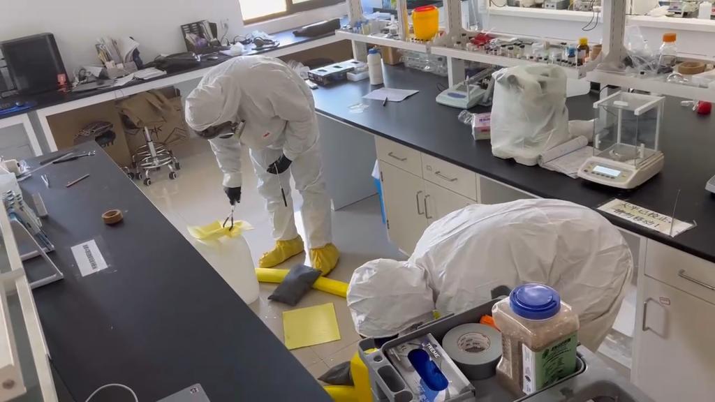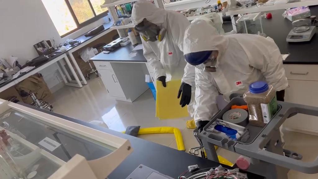 现场模拟了学生在实验过程中操作不慎引起烧杯内的酒精起火,同学们用灭火毯马上扑灭。随后又不慎将丙酮打翻,泼洒到学生身上和地面,造成丙酮泄露。实验室安全负责人收到学生报告后的第一时间立即做出应急响应,安排学生进行冲洗和救援,并报告体育博彩领导