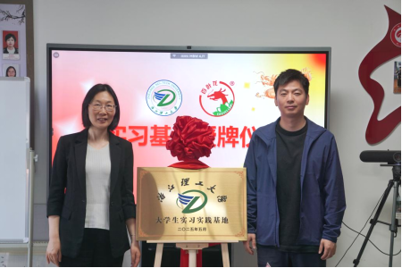 大学生实践实习基地授牌仪式,学院党委书记仰滢向浙江昊能科技有限公司总裁卢宏庆授牌。