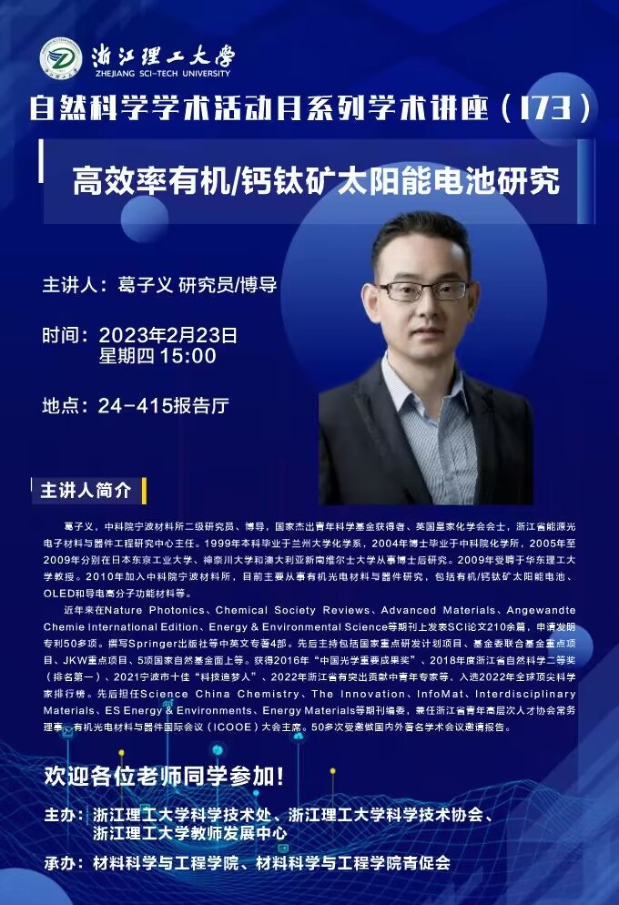 学术讲座【49】:高效率有机/钙钛矿太阳能电池研究
