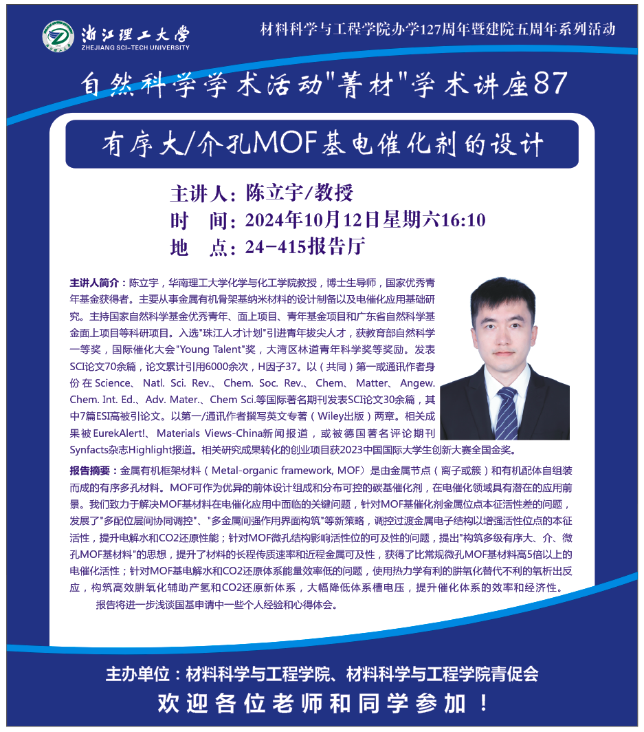 学术讲座【87】:有序大/介孔MOF基电催化剂的设计