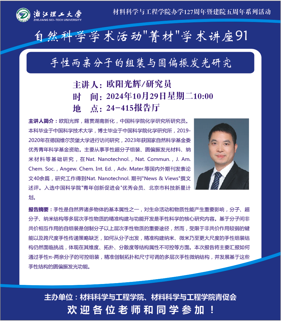 学术讲座【91】:手性两亲分子的组装与圆偏振发光研究