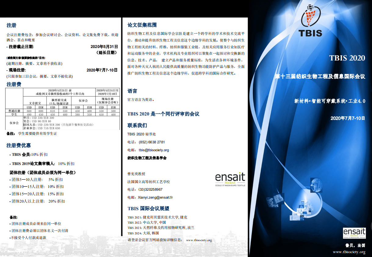学术会议 当前位置: 体育博彩 > 学术会议 > 正文 TBIS 2020第十三届纺织生物工程及信息国际会议-补充通知 作者:时间:2020-03-17浏览次数: 各位老师: 会议论文/摘要截止日期由2月28日延长至4月17日。