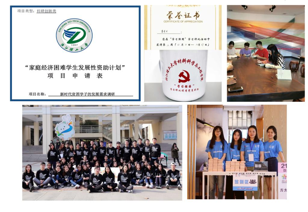 获省政府奖学金(2次)、纺织之光奖学金(1次)、校级外语优秀奖(2次)、校级优秀团干部(2次)、校级优秀班干部(2次)