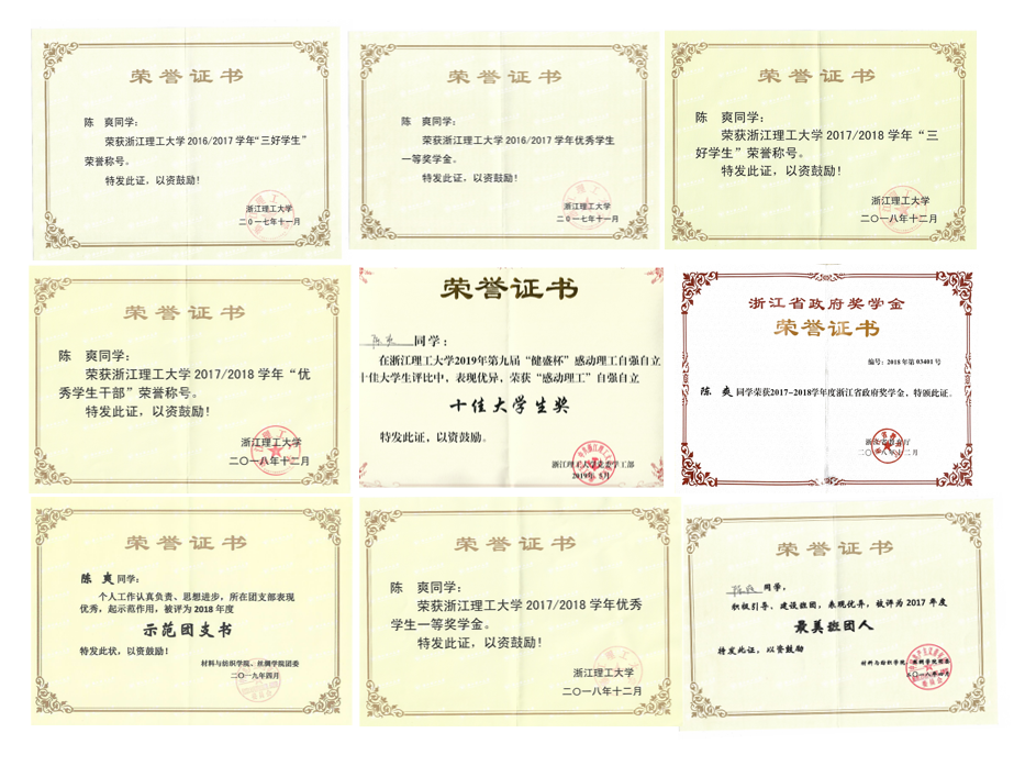 学科绩点:4.19,专业排名:1/94。2018年7月前往巨石集团、恒石纤维基业有限公司、南都电源、纳晶科技有限公司,2018年8月赴广东深圳调研。