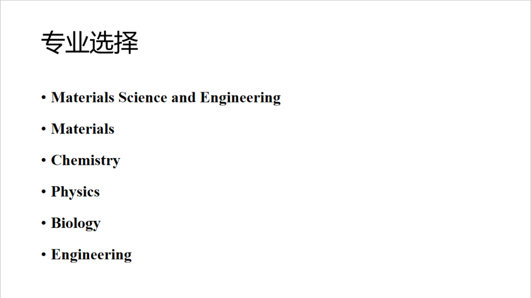 关于专业的选择,我们专业的全称是材料科学与工程,但实际上很多院校,包括国内国外,并没有独立的材料学院甚至材料专业,所以在检索感兴趣的项目的时候,大家可以把关键词范围延伸,不要仅仅局限于材料,像化学、物理、生物甚至是工学院都有可能涉及你感兴趣的研究方向。