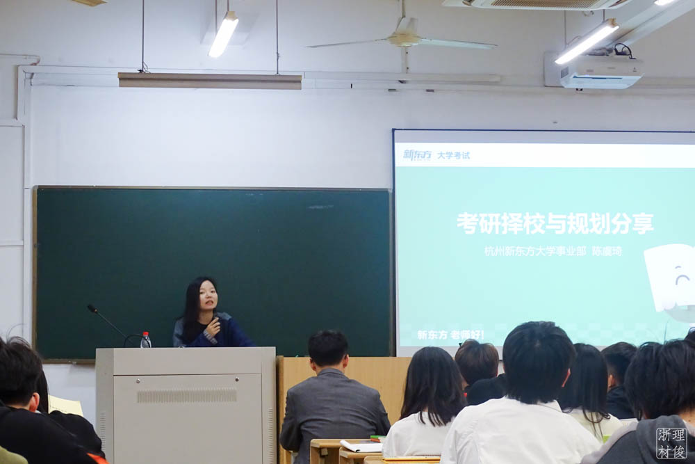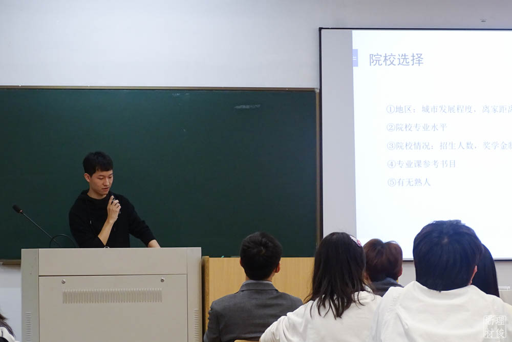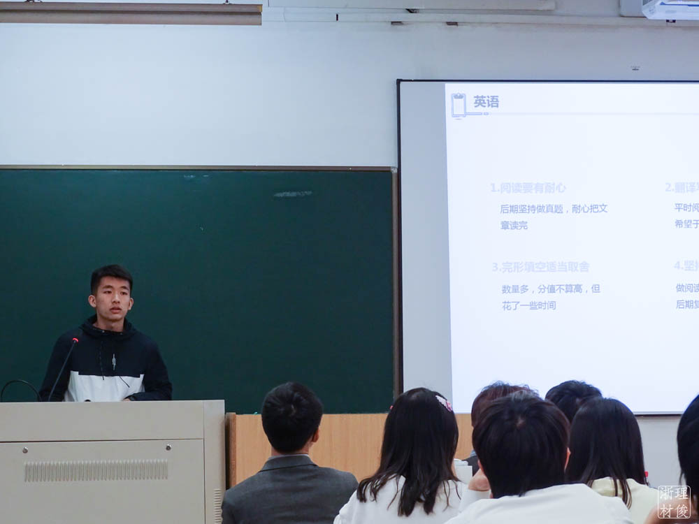会上,学院还聘请2017级考研优秀生为“考研小导师”,以小小的平台,2018级考研同学们的“研途”护航。同时, 党员“1+1”结对帮扶暨考研护航正式启动,学院拟聘请研究生党员为2018级考研学子进行“1+1”结对,为大家提供指导与服务,并且督促鼓舞引导每一位考研材俊, “考研过程中你不是一个人在战斗”,研究生党员代表章睿同学进行发言,章睿表示,作为一个过来人,自己也回忆起考研充实难忘的经历,希望能给大家的考研之路出一份力。最后,新东方进行了一场公益讲座,由杭州新东方大学事业部考研英语老师为大家带来考研择校与规划分享。