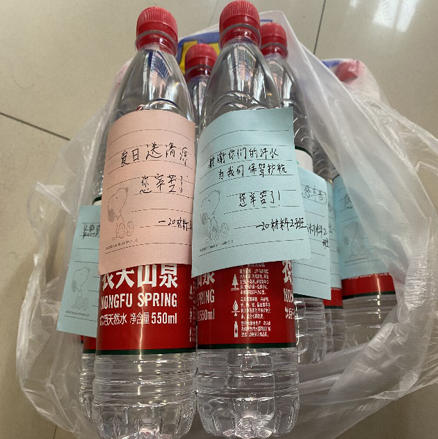 20材料2团支部的同学们想借着展开团日活动的机会,给夏日守在马路边和保安室的保安们送上我们的小小的谢意。2班的团支书和副班长准备了矿泉水,定制学党史小扇子,以及感谢的话语,并且安排同学们将这些小小的礼物送给保安们。
