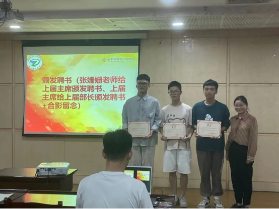 张姗姗老师为上届副书记团颁发聘书、为本届副书记团佩戴工作证;上届副书记团为上届部长颁发聘书,本届副书记团为本届部长、干事佩戴工作证。工作证戴在胸前的那一刻,既是荣誉加冕,又是责任在肩,往后的路还很长,需要全体干部一步一步坚定走下去。