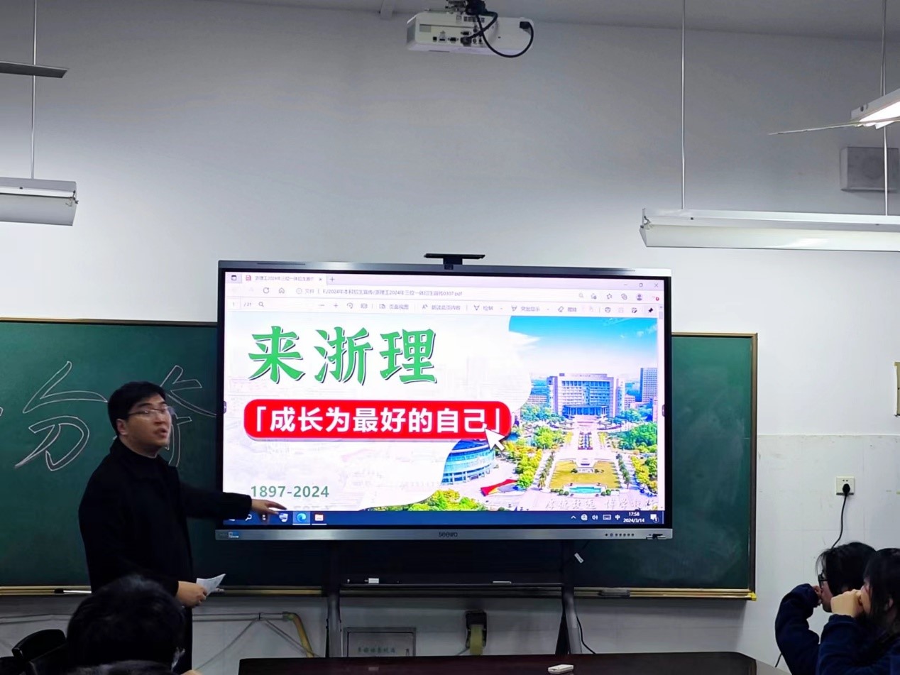 会后,在温岭市第二中学高三前幢教学楼407会议室,黄君以“来浙理成长为最好的自己”为主题进行2024招生政策宣讲。