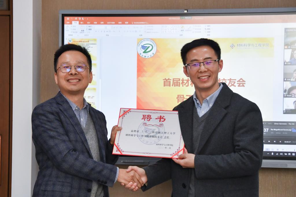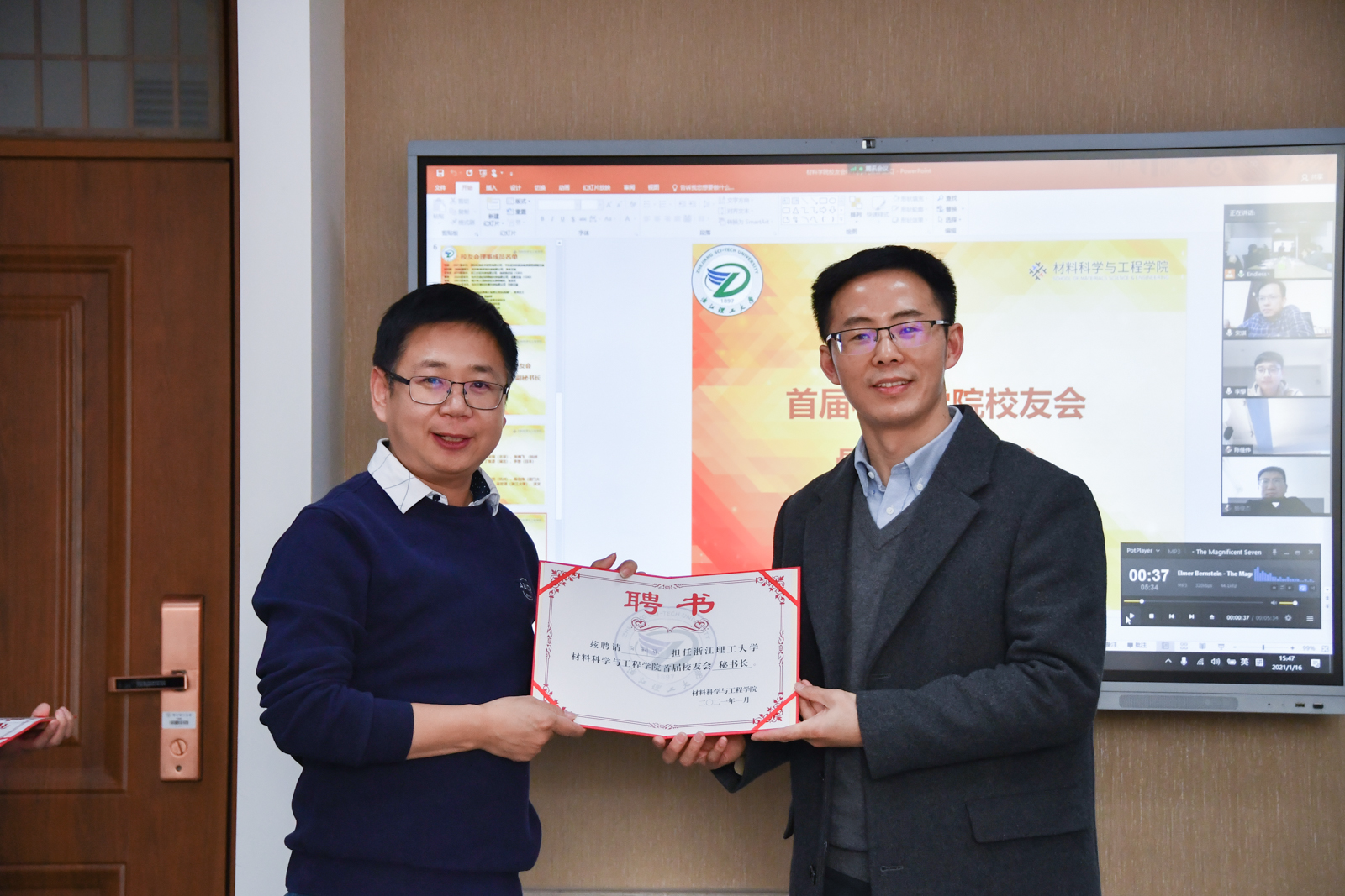 校友会章程》、学院首届校友会理事建议名单以及学院首届校友会会长、副会长、秘书长和副秘书长建议名单;会议选举2001届校友苏健为校友会会长,选举2008届(研)校友白利强为校友会秘书长。随后,周照东为校友会骨干成员颁发聘书,陈艳为校友会颁发会牌、会旗。