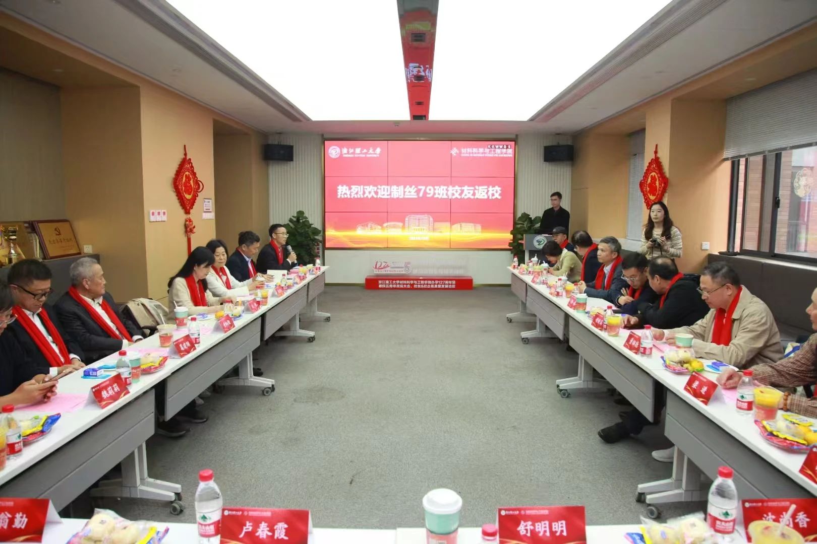 会上,校友们一起自由交流,分享着各自的经历,谈论母校的变化和发展,为学院发展送上祝福。校友们在会议厅合影留念,他们的笑容定格在这一刻,就像他们的青春一样,在浙理的校园里灿烂如花。