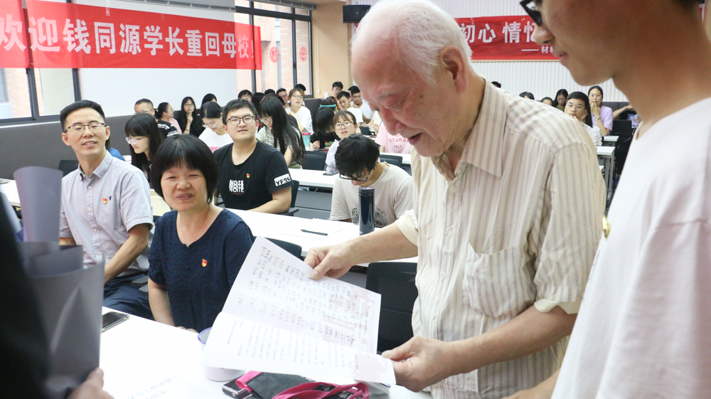 钱老虽已86岁高龄,长达一个小时的党课,全程站立脱稿为大家讲课。自带幽默的亲近感,极强的记忆力,提起党史上的每一个事件总能准确说出具体年月日,大家的敬重之心油然而生。学生党员代表为钱老先生送上100名师生党员联名写给钱老的一封信,以及材料微结构大赛图鉴作为纪念,钱老欣然题词鼓励同学们。一张卡片,承载着大家对钱老的敬仰和爱戴。
